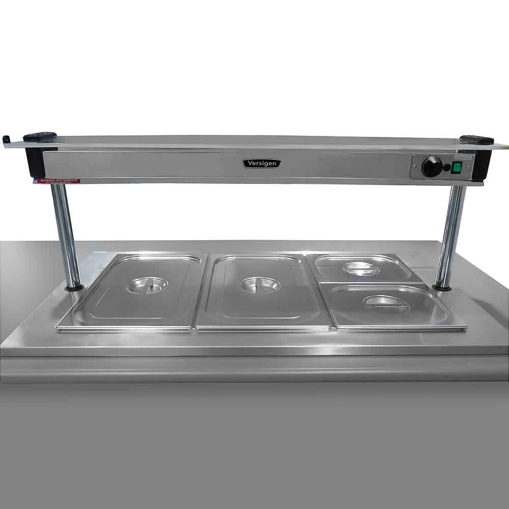 Versigen In-Counter Bain Marie's keep cooked food at the correct serving temperature. Accommodates 1/1GN and smaller equivalent gastronorm pans up to 200mm deep. Supplied complete with a quartz-heated heated/illuminated gantry and tempered curved glass sneeze screen.